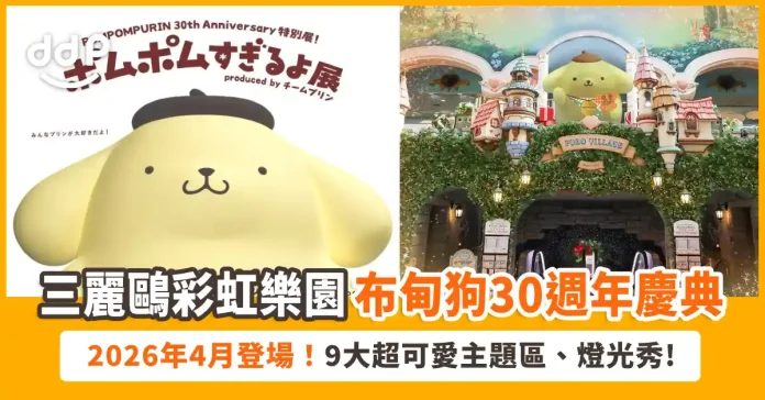 布甸狗於2026年迎來30週年,三麗鷗彩虹樂園將於2026年4月10日起,化身成一整個被黃金獵犬男孩包圍的療癒天堂!在「POMPOMPURIN 30th Anniversary」活動期間,整座樂園換上溫暖金黃色調,打造專屬布甸狗的夢幻世界,特展、燈光秀、拍照打卡點一次到位,讓大家一起感受布甸狗的魅力!