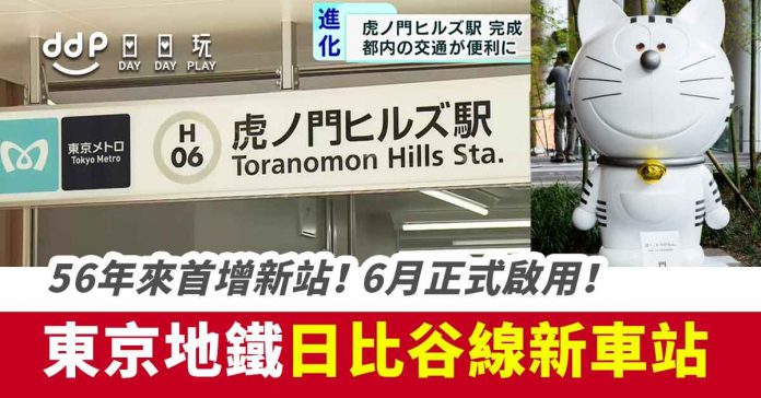 1964年全線通車的「日比谷線」,暌違56年首度增設新車站,站名為「虎ノ門ヒルズ駅」(虎之門之丘),車站位於「霞之關站」及「神谷町站」之間,編號為「H06」,新車站可以直接由銀座線「虎之門站」站轉乘,在地下通道走7分鐘可達,現時該站與前往市中心、臨海地區、機場的巴士車站直接連結,十分方便!「虎之門之丘站」將於6月6日正式啟用,而車站的地下二增則仍然在動工中,預計2023年完成,目標是配合同年落成的「虎之門之丘車站大樓」,到時車站可以直接連結該區多座超高層大樓。