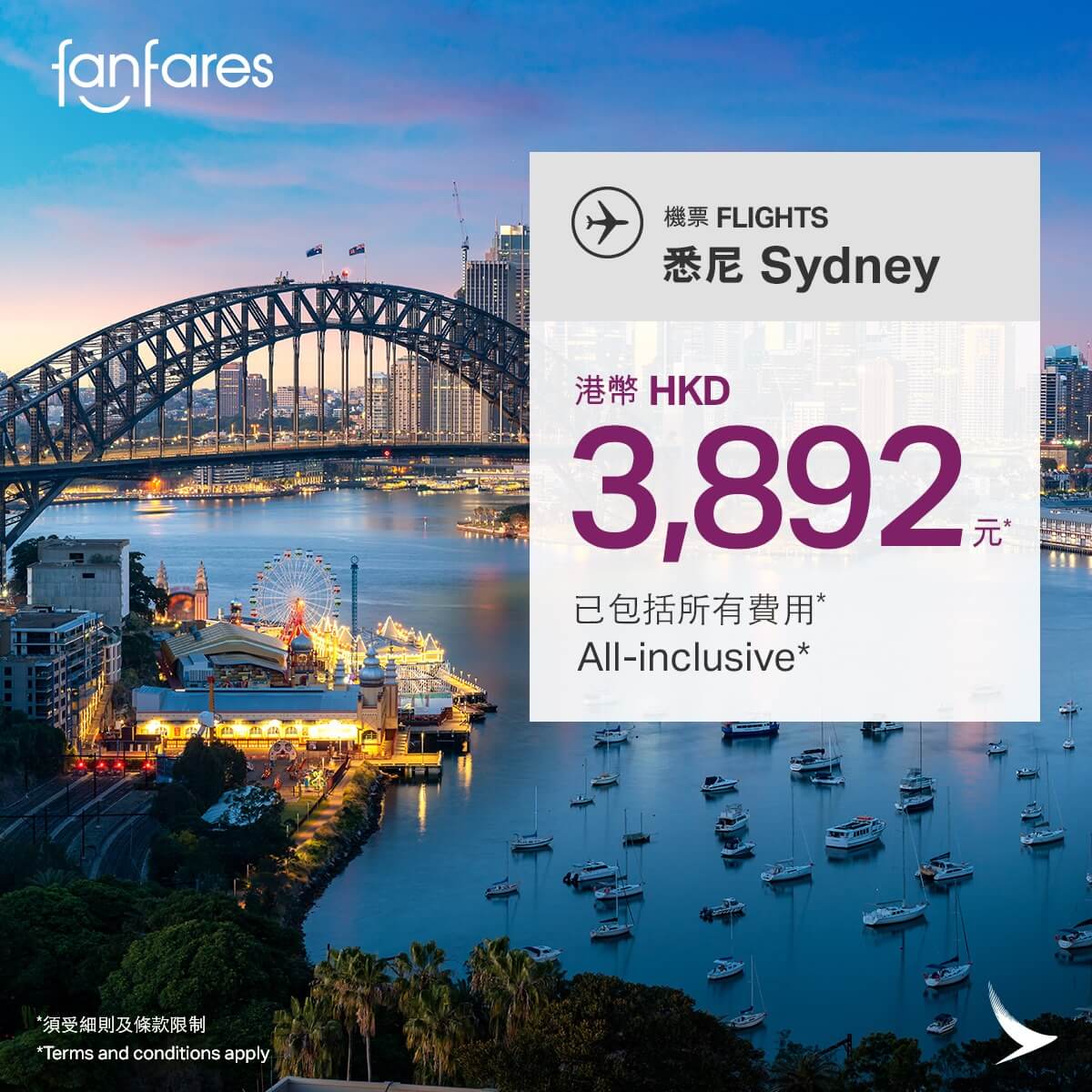 悉尼 (雪梨) 經濟客艙 港幣3,892元