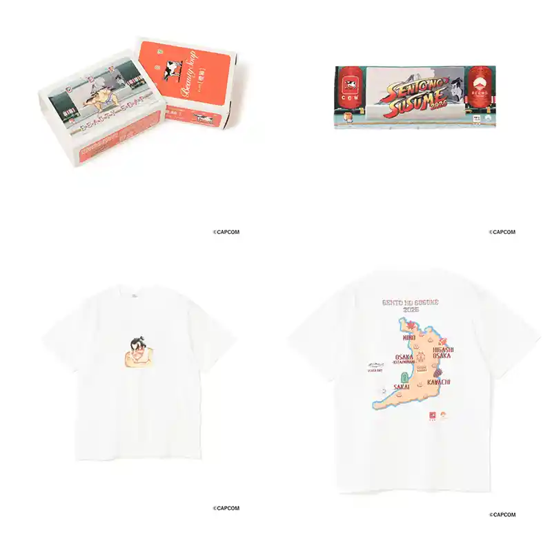 最搶眼的莫過於以《街頭霸王II》LOGO設計的「SENTO NO SUSUME(錢湯推薦)」字樣手帕,視覺衝擊力滿點!左右兩側還畫上牛奶香皂與BEAMS的提燈,設計超有特色。還有T恤、帽子、桑拿帽、澡盆和身體毛巾等豐富合作商品,每一件都融入遊戲迷愛的元素,買回家絕對是收藏與實用的雙重享受!