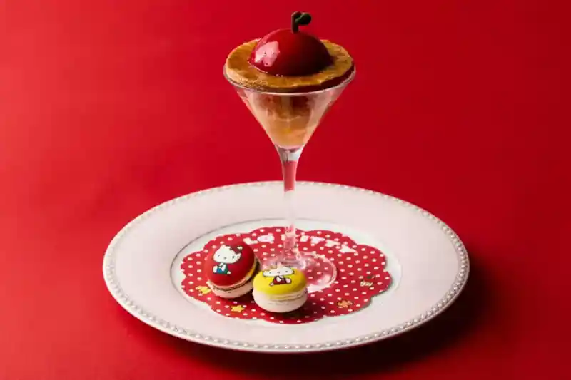 自助餐區充滿70年代的復古元素,桌面還點綴著原創餐墊和杯墊,增添趣味。主打甜點中,Hello Kitty最愛的蘋果派化身杯子甜點,層層堆疊著蘋果果凍、卡士達醬和煮蘋果,再蓋上酥脆派皮和蘋果慕斯,既可愛又美味!圓潤的馬卡龍則以Hello Kitty和Mimmy的絲帶色彩設計,紅茶口味甘納許奶油藏在Kitty的甜點裡,而Mimmy則帶來起司奶油的驚喜,咬下去幸福感爆棚!