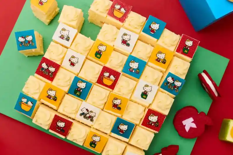 還有以Hello Kitty臉型打造的起司蛋糕,搭配烤餅乾和以絲帶為靈感的「盛裝絲帶杯子蛋糕」,讓你沉浸在雙胞胎角色的萌系宇宙。「HELLO KITTY拼布蛋糕(草莓味)」和「HELLO MIMMY拼布蛋糕(桃子味)」更是亮點,上面點綴著11款原創70年代畫風設計,圖案萌到不行,讓每個甜食時刻都像藝術品!