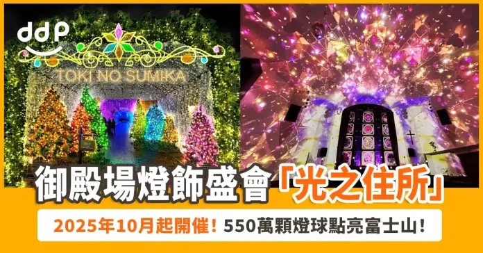 御殿場高原時之栖的「光之住所」燈飾活動於2025年10月11日~2026年3月8日期間舉辦,今年將以「魔法森林」為主題,點亮約550萬顆燈球,打造20公尺富士山主題樹、300公尺光之隧道與五大奇幻區域,並設有投影的魔法教堂、升級的王宮之丘夜間步行、旋轉木馬與夜間泡泡秀等多項表演!