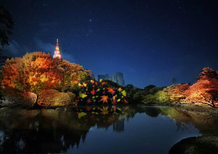 NAKED團隊以中之池和周邊的楓樹為基礎,打造出另一幅令人動容的作品《秋色之光》。池畔旁的樹木被炫彩的光束所照亮,繽紛的色彩在水面上交錯反射。數不勝數的楓葉和銀杏葉在樹林間輕盈地飄舞著。自然和光雕藝術的結合與遠邊高聳大樓的輪廓融合在一起,營造出只有在新宿御苑才能欣賞到的迷人秋夜景色。