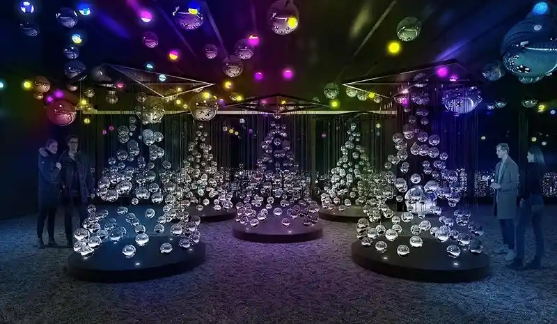 走進室內迴廊「SKY GALLERY」,大大小小的鏡球打造出閃耀如鑽石的幻想空間,與落地窗外的奢華夜景完美呼應。80個LED組成的「NEBULA」燈球則帶來絲滑漸層的極光效果,混雜一點DISCO復古風情,這種獨特的魔幻氛圍在其他聖誕點燈中絕無僅有!無論是拍照打卡還是沉浸體驗,這裡都讓人流連忘返!