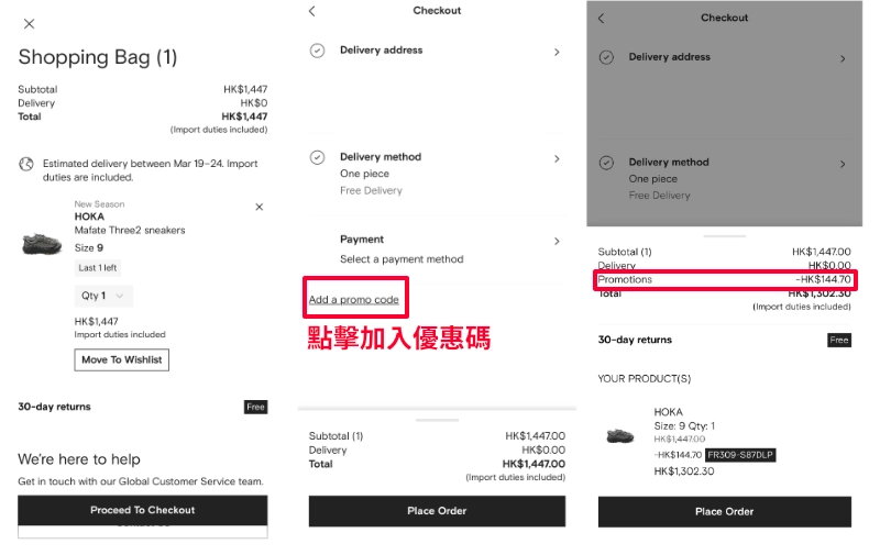 第二步 – 手動輸入:在購物車結帳時,點擊「Add a promo code」後輸入折扣碼。