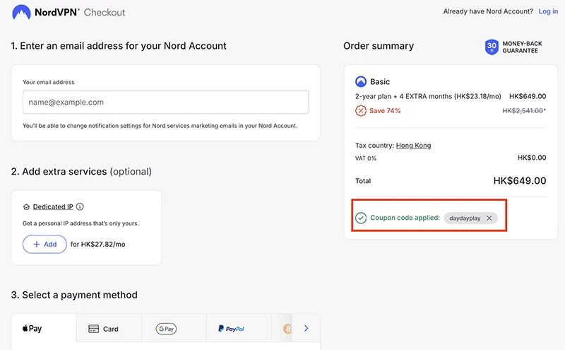 訂閱 NordVPN 時不需輸入Promo Code/折扣碼,只需經指定鏈結購買,折扣優惠將會即時扣減。輸入我們的獨家優惠碼「DAYDAYPLAY」即額外送多1個月。